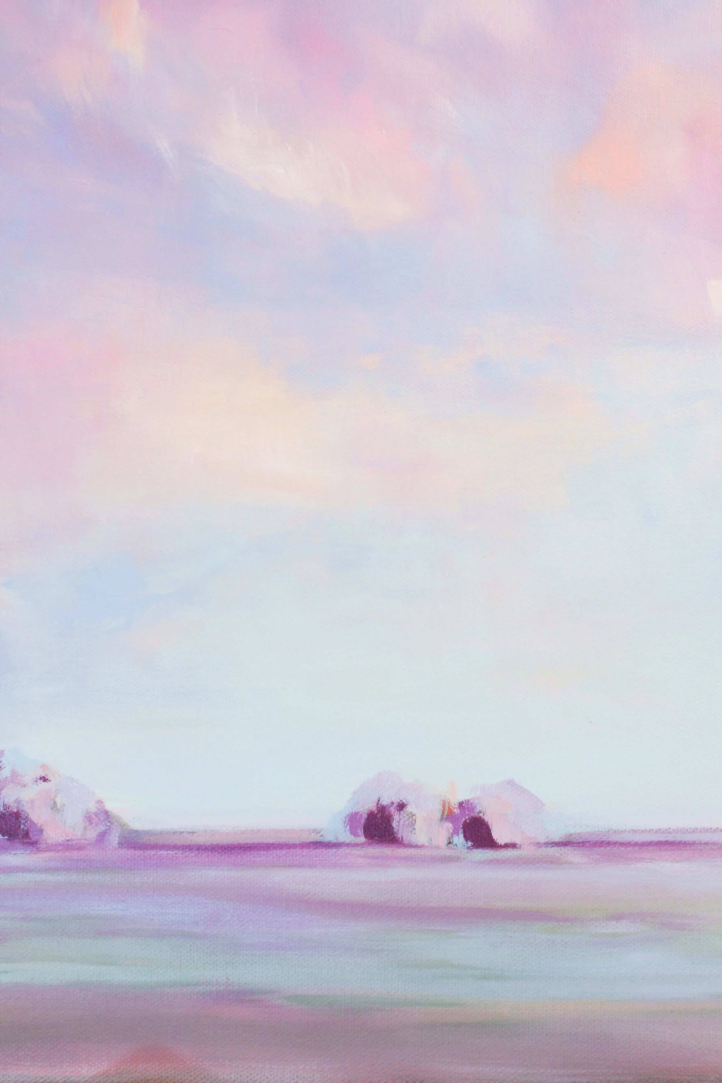We all dream of somewhere else. Whether it’s somewhere we’ve been, or somewhere we frequently return to, where we are now often isn’t where we want to be. Thankfully, paintings like ‘Day Dreaming’ can take us there as soon as we lay eyes on it. This seems to be a quintessential “Elizabeth” painting for a few reasons: the wide and narrow format, the big sky, and the loose interpretation of the land. There is texture and depth in the sky that signify movement and the fleeting nature of the light in this moment. The subtle shifts in color that add visual interest and depth to the sky, from a cobalt blue to a turquoise-y teal, each layer building upon the last.