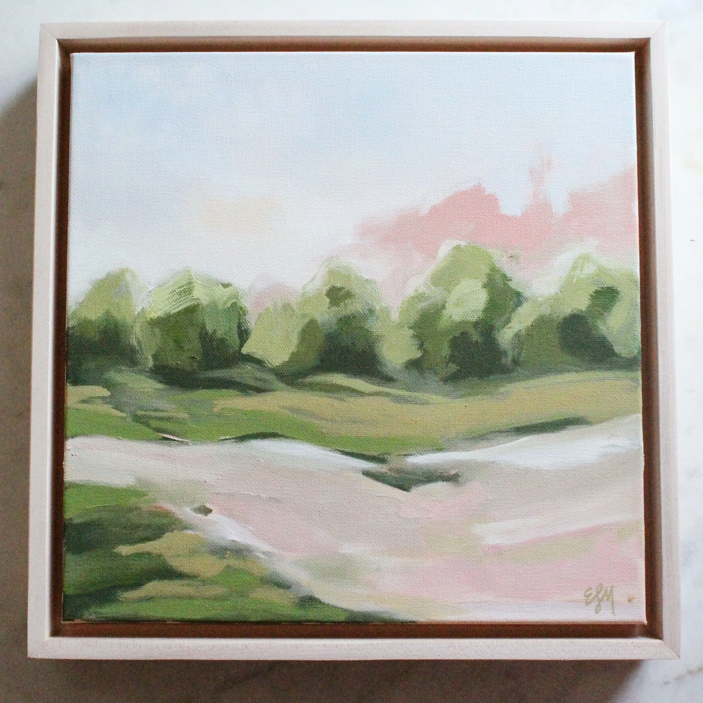 With this collection of paintings, I wanted to capture that quiet feeling with smooth brush strokes, gently blended together. The colors are a little less vibrant (by my standards anyway), but I managed to sneak in some warm rosy tones that the still-vibrant sky reflects onto the graying land. The color of the bare trees nearly blends into the land, collapsing the strict horizon line. The grasses glow golden with the evening light, but reflect a glowing white with morning frost. A Texas Winter is unique, with a blend of dormant and evergreen plant life, and colors that change with the season. My goal is always to capture the changing seasons of a single place, and to glean some understanding of the cycles of nature, and the cycles of life.