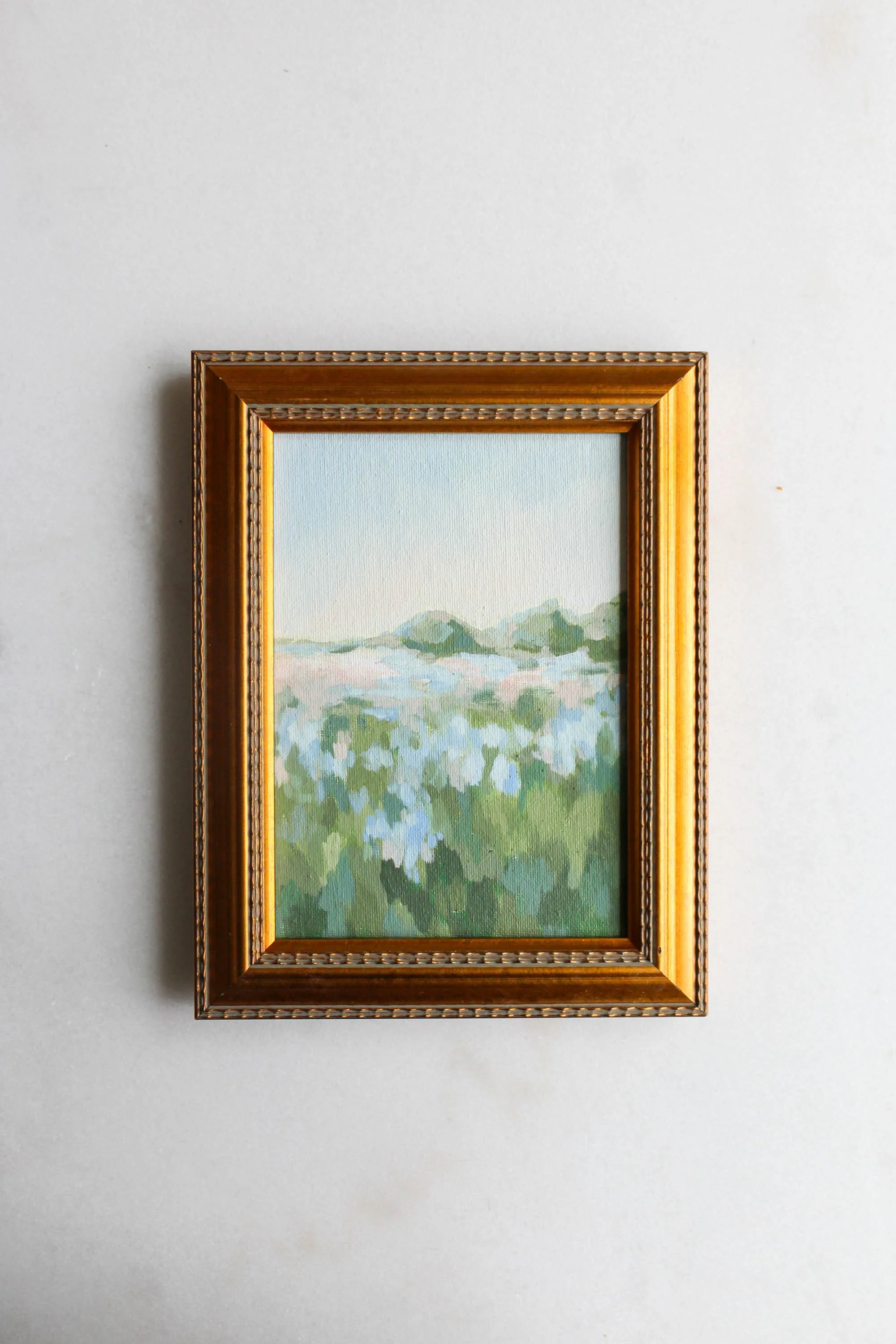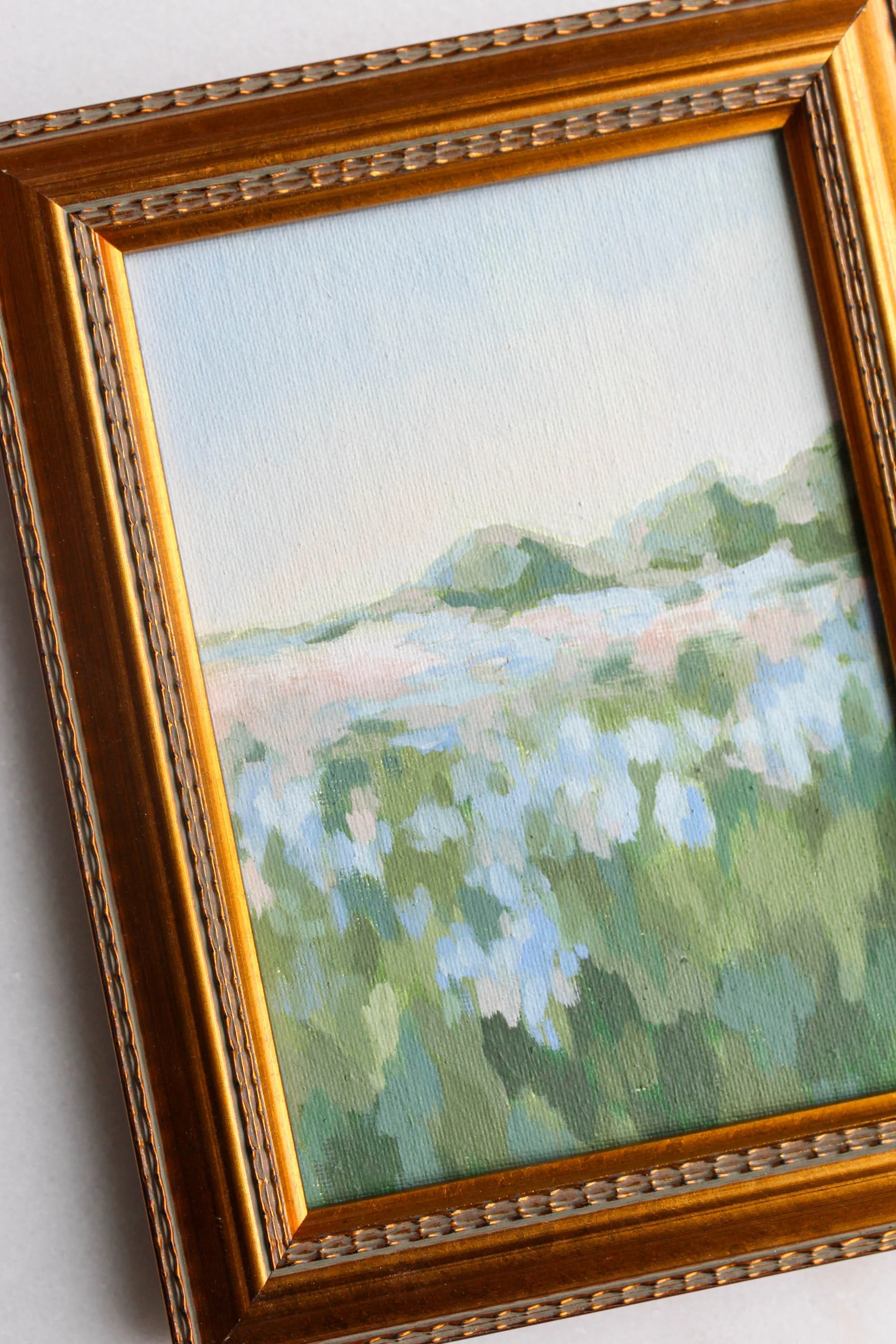This is an original oil landscape painting onsite at Magnolia Market this summer! The painting on canvas board is framed in a gorgeous rounded wooden frame, and will be fitted with a wire for seamless hanging.