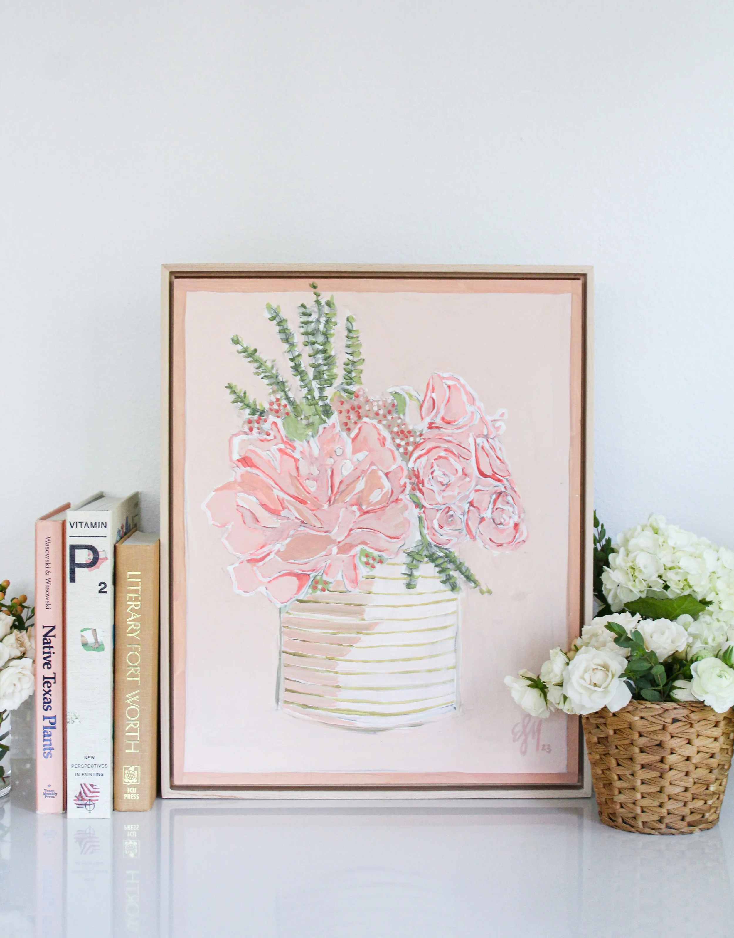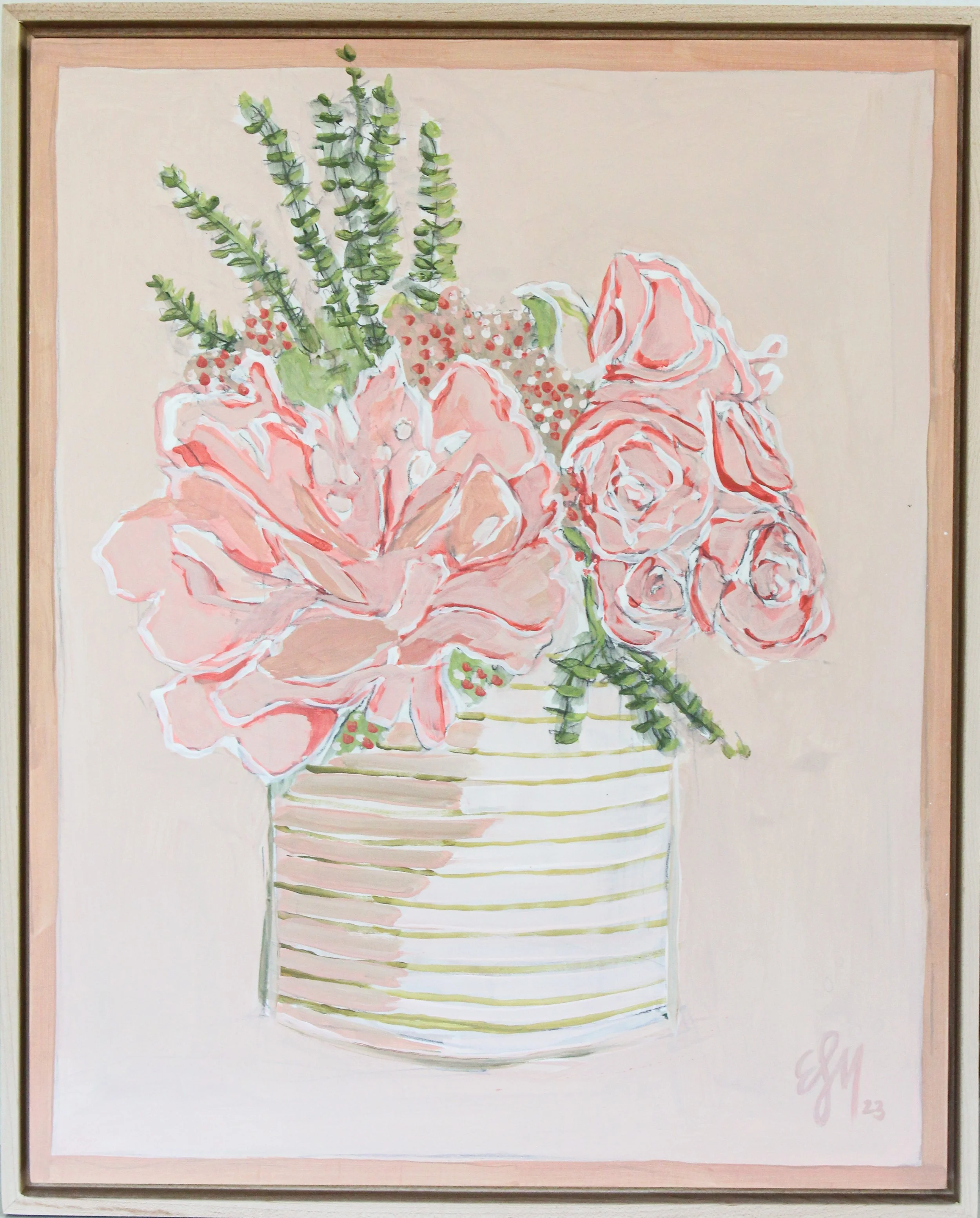 This painting on panel began as a quick graphite sketch, and then finished with layers of rich acrylic paint. The finished piece is sealed with a matte varnish for archival purposes and UV protection. Each floral still life is finished with a gorgeous natural wood floating frame. The framed artwork measures 17x21”, and will arrive to you ready to hang.